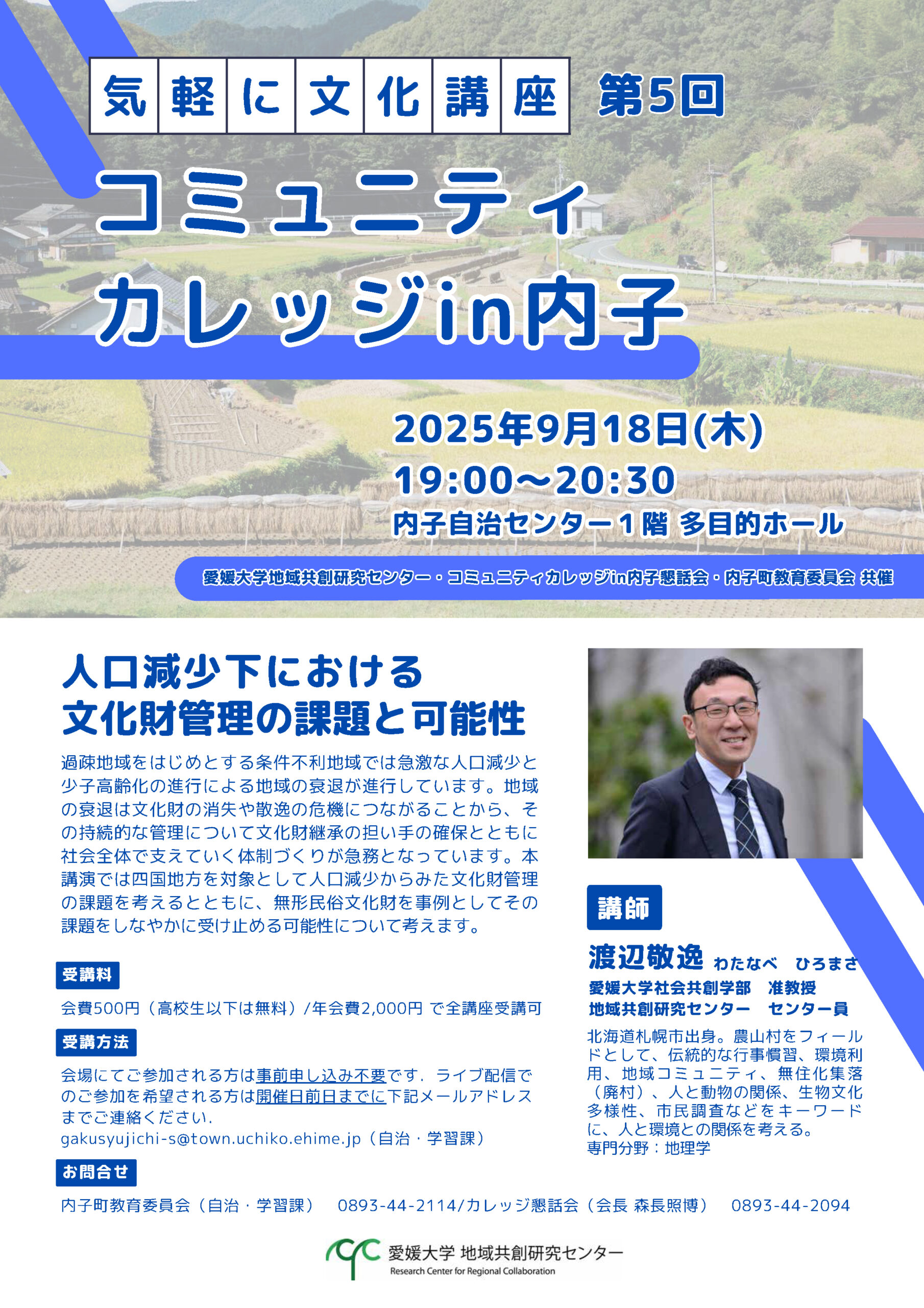 気軽に文化講座「コミュニティカレッジ in 内子」 第5回「人口減少下における文化財管理の課題と可能性」を開催します。