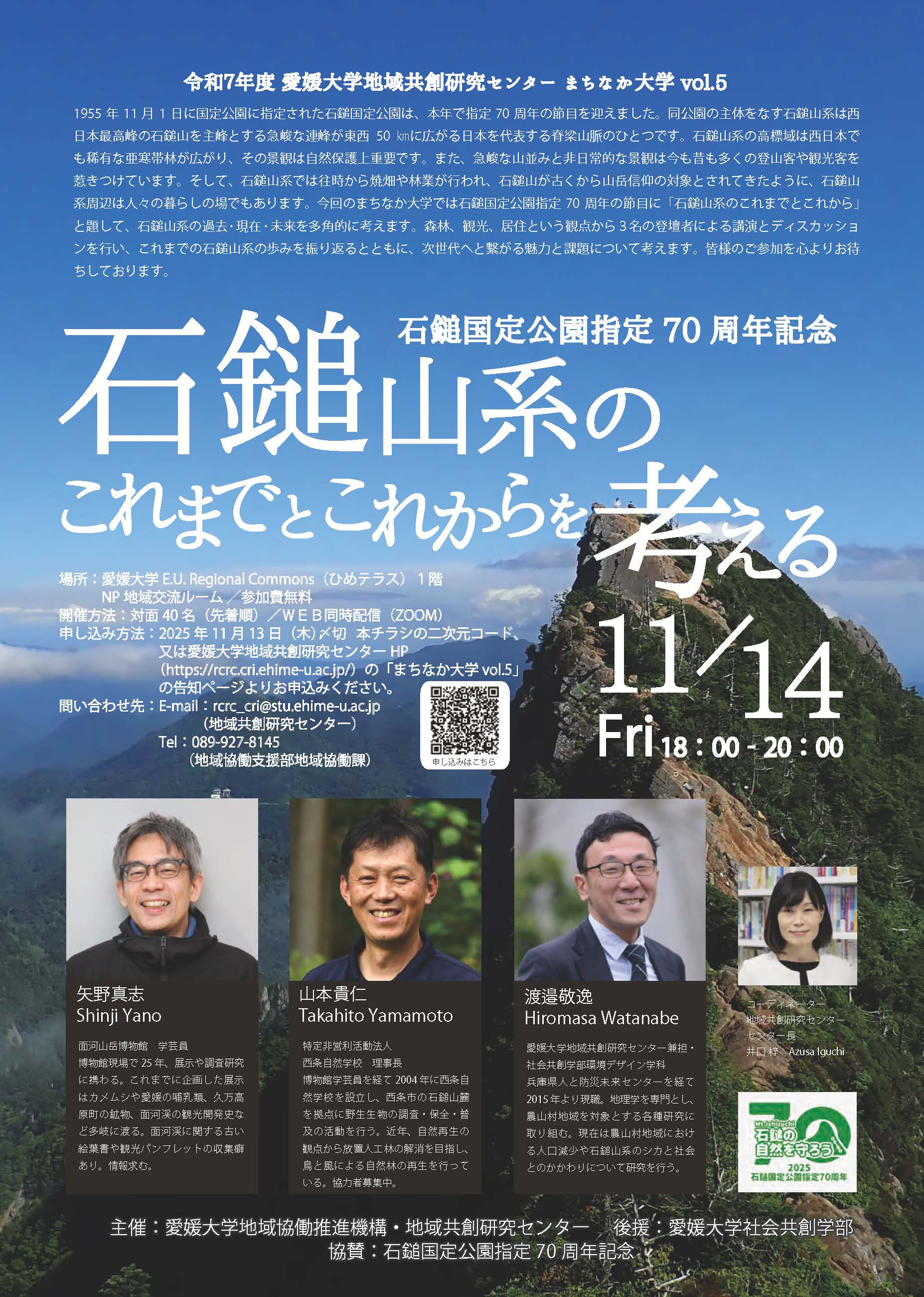 1955 年11 月1 日に国定公園に指定された石鎚国定公園は、本年で指定70 周年の節目を迎えました。同公園の主体をなす石鎚山系は西日本最高峰の石鎚山を主峰とする急峻な連峰が東西50 ㎞に広がる日本を代表する脊梁山脈のひとつです。石鎚山系の高標域は西日本でも稀有な亜寒帯林が広がり、その景観は自然保護上重要です。また、急峻な山並みと非日常的な景観は今も昔も多くの登山客や観光客を惹きつけています。そして、石鎚山系では往時から焼畑や林業が行われ、石鎚山が古くから山岳信仰の対象とされてきたように、石鎚山系周辺は人々の暮らしの場でもあります。今回のまちなか大学では石鎚国定公園指定70 周年の節目に「石鎚山系のこれまでとこれから」と題して、石鎚山系の過去・現在・未来を多角的に考えます。森林、観光、居住という観点から3名の登壇者による講演とディスカッションを行い、これまでの石鎚山系の歩みを振り返るとともに、次世代へと繋がる魅力と課題について考えます。皆様のご参加を心よりお待ちしております。